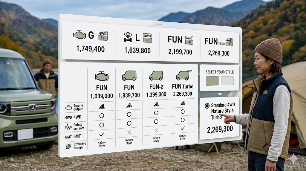 一方で、週末のキャンプ、車中泊、釣り、あるいは自転車やバイクを積むトランポ(トランスポーター)としてプライベート主体で楽しむなら、LEDヘッドライトや丸目の愛嬌あるデザイン、急速充電USBが備わった「FUN」グレードが一押しです。さらに、「せっかく買うならデザインに妥協したくない!」という方には、専用の内外装が施された「NATURE STYLE」が最高の選択肢になります。