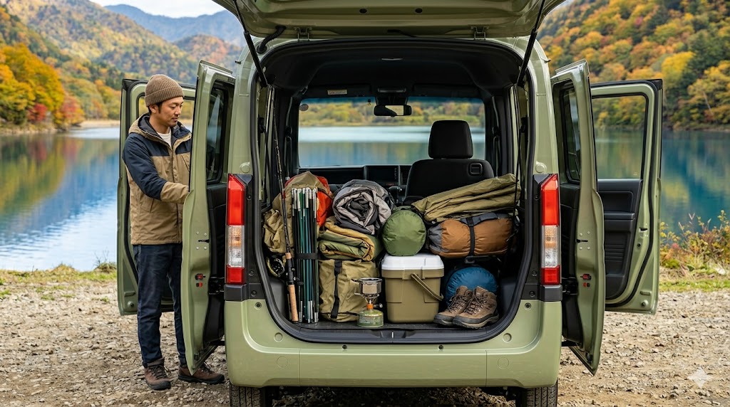N-VANはその広大な室内空間ゆえに、ベッドキットを組んだり、重いキャンプ道具や釣り具、ポータブル電源などを大量に積み込んだりする使い方が定番です。