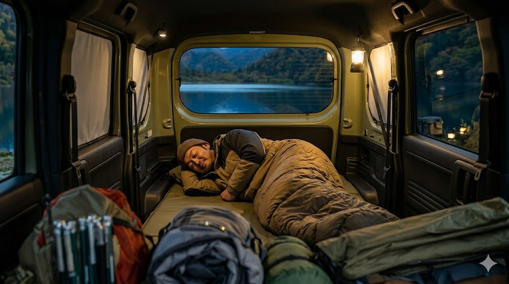 この広大でフラットな室内空間は、荷物を積むだけでなく、そのまま極上の「車中泊スペース」へと早変わりします。