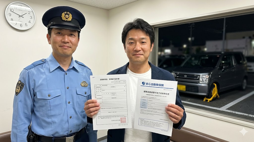 まず第一に、何よりも早く「110番」をして警察に通報してください。初動捜査が早いほど、近隣の防犯カメラの確認や検問などで車が発見される確率が上がります。警察官が現場に到着したら状況を説明し、その後最寄りの警察署に出向いて「盗難届(被害届)」を提出します。この手続きが無事に終わると発行される「受理番号」は、この後の保険金請求の手続きで絶対に必要になる非常に重要な番号です。