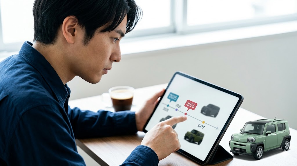 では、具体的に新型タフトはいつ市場に投入されるのか?という点ですが、これまでの業界のセオリーやライバル車の動向を総合的に分析すると、私は2026年〜2027年頃が最も有力なフルモデルチェンジのタイミングではないかと睨んでいます。