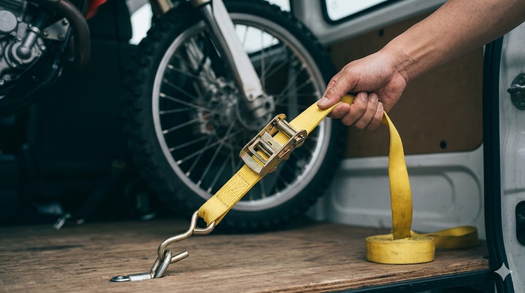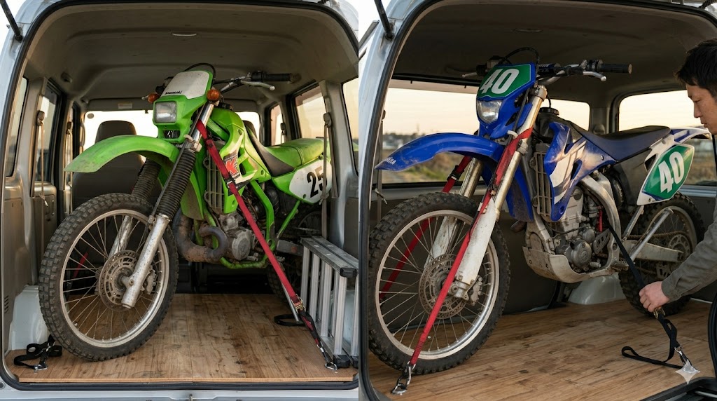 バイクが物理的に荷室に入ることが分かったら、次は「どうやって安全に積み込み、走行中に倒れないように固定するか」です。