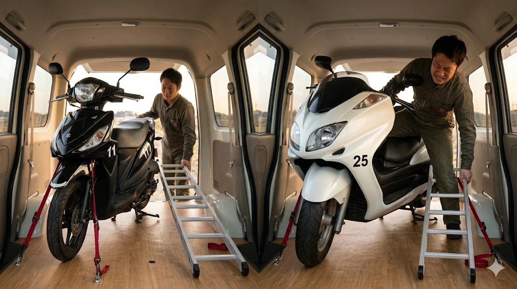 スクーターの積載は、普通のギア付きバイクとは全く違う難しさがあり、実はトランポ初心者にとって最大の落とし穴になりがちです。