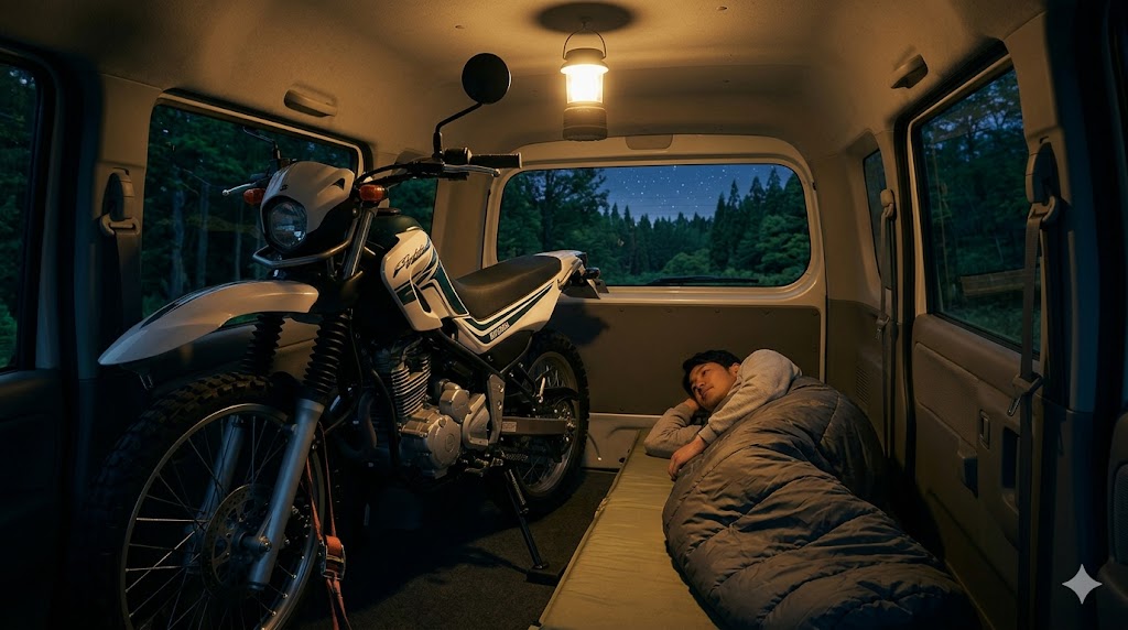 バイクで遠くのモトクロスコースやツーリング先に出かけ、前日の夜から現地入りして、そのまま愛車の隣で車中泊を楽しみたい!という夢を抱いている方も多いでしょう。