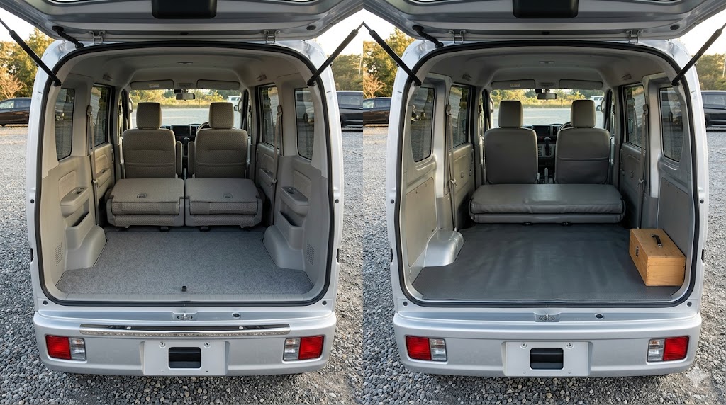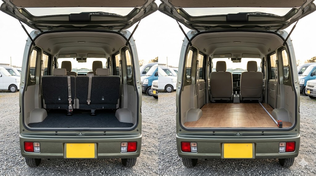 トランポとしてミニキャブバンを使うなら、乗車定員の使い方、つまり「2シーターにするか、4シーターにするか」は非常に重要なポイントであり、トランポ運用における最初の分かれ道になります。