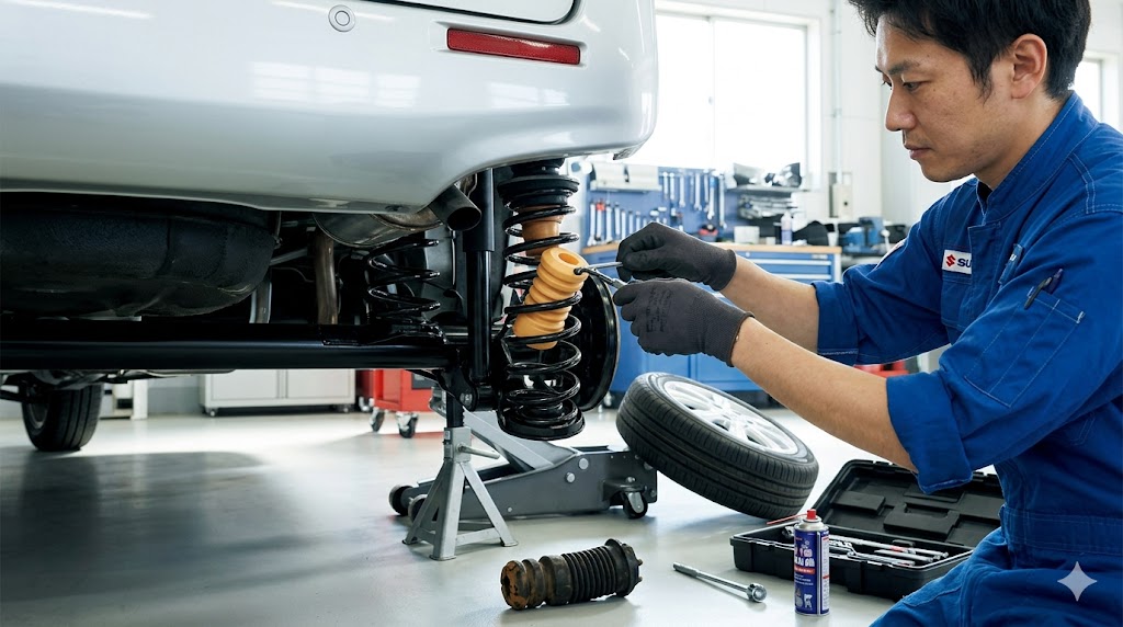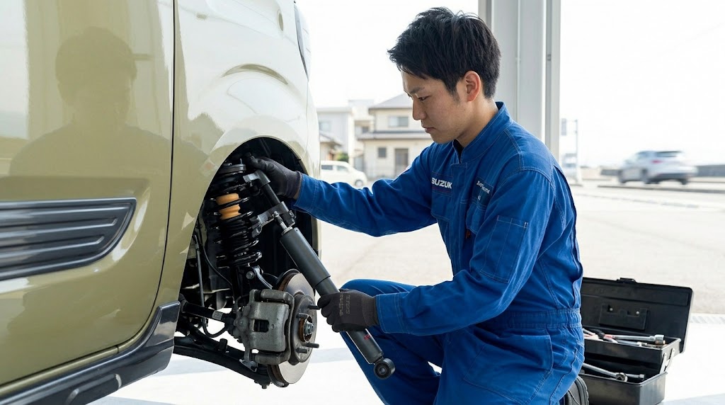 空気圧を適正値に直したり、コンフォートタイヤに履き替えたりしても、どうしても乗り心地の悪さが我慢できない場合。あるいは、すでに走行距離が5万キロ、10万キロを超えているような中古車のスペーシアに乗っている場合は、足回りの心臓部であるサスペンション(ショックアブソーバーとスプリング)そのものの劣化や寿命を疑ってみるタイミングかもしれません。