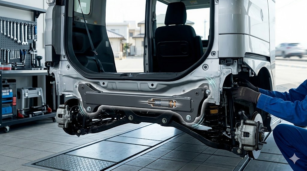 さらに一歩進んで、足回りから本格的に乗り心地を良くしたいのであれば、硬い純正バンプラバーを柔軟なウレタン製のショートタイプに交換したり、ボディの微細な振動を抑え込む先進パーツであるモーションコントロールビーム(MCB)を導入したりすることで、突き上げ感や高速道路での横風によるフラつきといったスーパーハイトワゴン特有の弱点を効果的に打ち消すことができます。