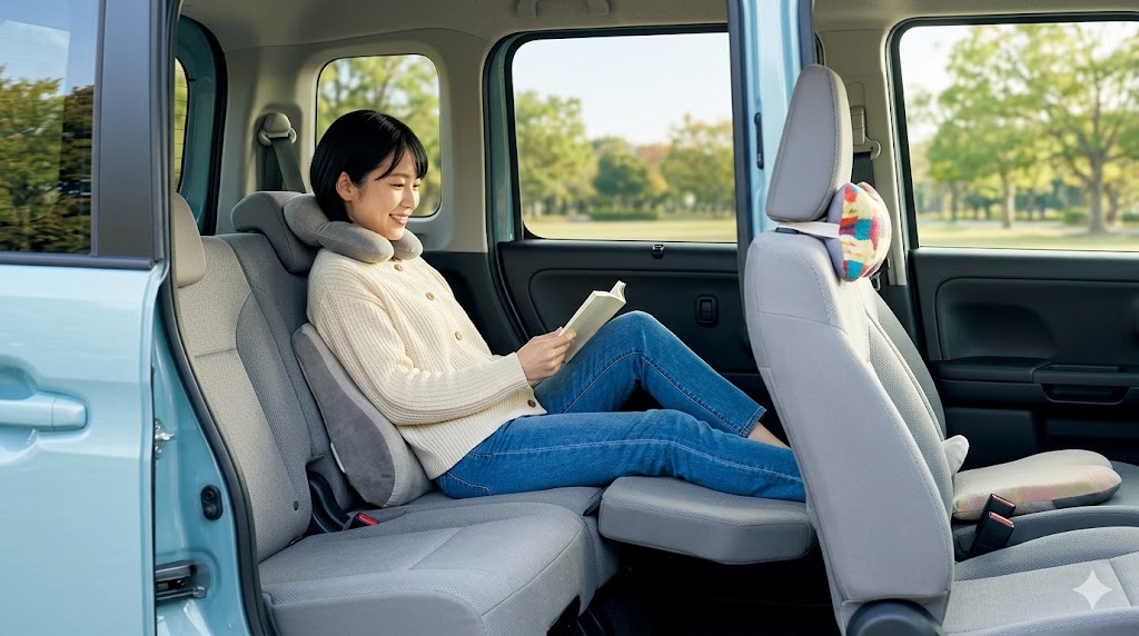 もし旧型のスペーシアに乗っていてこの機能がない場合は、市販のカー用品を上手に活用してみましょう。例えば、体の形に合わせてじんわり沈み込む低反発素材のシートクッションや、腰とシートの隙間を埋めてくれるランバーサポート、首の揺れを抑えるネックパッドなどを後部座席に追加するだけでも、カーブや段差で体が無駄に動かなくなり、長時間のドライブでも驚くほど疲れにくくなります。