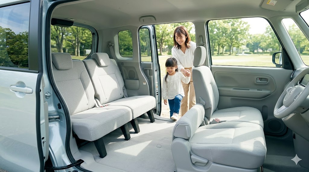 これにより、雨の日に運転席から後部座席の子供の世話をするために車内を移動したり、左側のドアから乗り込んで右側の席へ移動(ウォークスルー)したりする動作が、驚くほどスムーズに行えるようになります。