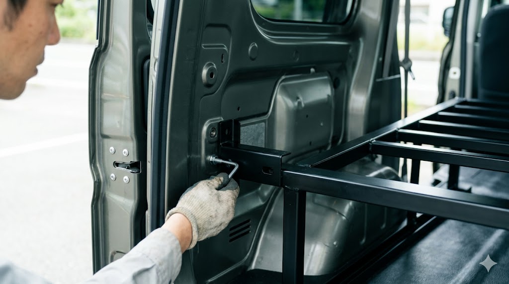 これを利用すれば、車体の鉄板にドリルで穴を開けるといった大掛かりな加工を一切することなく、ボルトオンでベッドフレームをガッチリと固定できます。