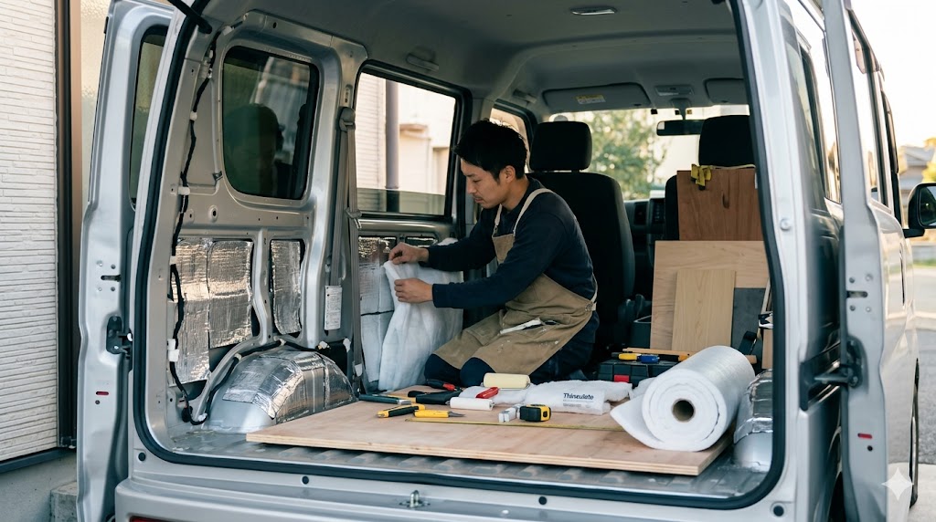 そのため、内張りをベリッと剥がして制振材(デッドニング)を貼り付けたり、隙間に断熱材(サーモウールなど)をぎっしり詰め込んだりする作業のハードルが極めて低いんです。