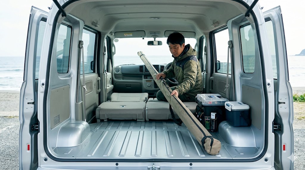 釣り竿やサーフボードなどを車内に中積みしたまま寝たい!という方にはたまらない仕様ですよね。