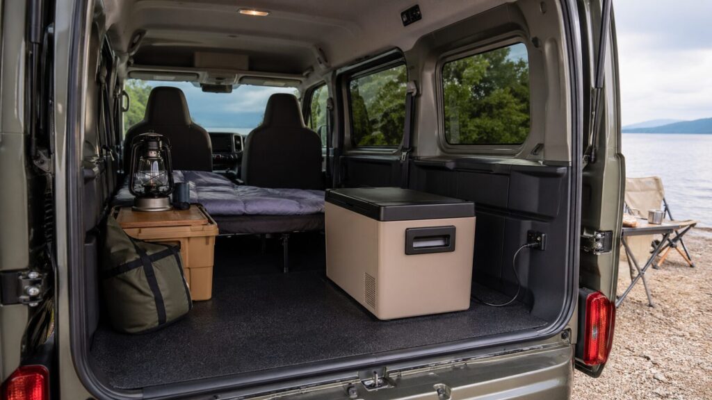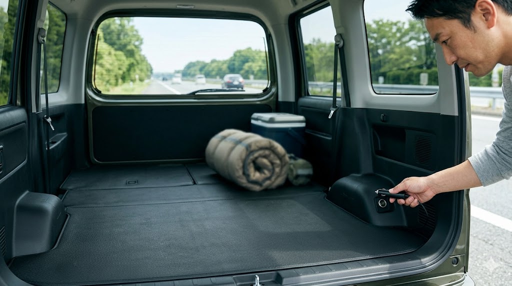 荷室の後方に電源があることで、ポータブル冷蔵庫を稼働させたり、電動工具のバッテリーを充電したり、キャンプ用のエアマットを膨らませるポンプを使ったりと、使い勝手が格段にアップします。