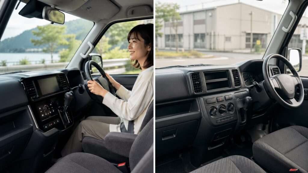 つまり、「走る・曲がる・止まる」そして「荷物をたくさん積む」という軽バンとしての基本的なクルマのポテンシャル自体は、どちらのグレードを選んでも違いはありません。では何が違うのかというと、日々の運転をサポートしてくれる先進装備や、車内の快適装備の有無なんですね。乗用車から乗り換える方にとっては、この装備の差が満足度に大きく影響してくる部分かなと思います。